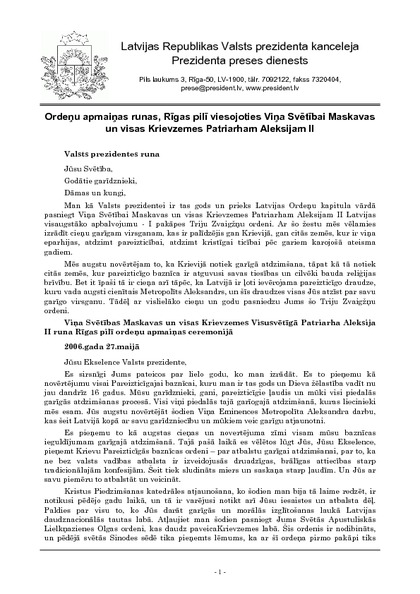 Ordeņu apmaiņas runas, Rīgas pilī viesojoties Viņa Svētībai Maskavas un visas Krievzemes Patriarham Aleksijam II