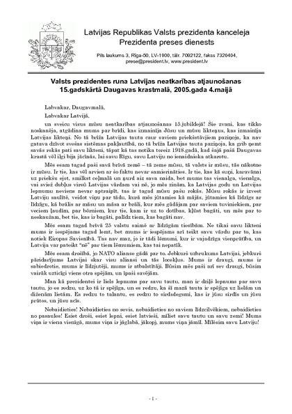 Valsts prezidentes runa Latvijas neatkarības atjaunošanas 15.gadskārtā Daugavas krastmalā, 2005.gada 4.maijā