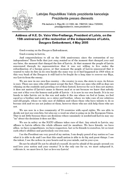 Address of H.E. Dr. Vaira Vike-Freiberga, President of Latvia, on the 15th anniversary of the restoration of the independence of Latvia, Daugava Embankment, 4 May 2005