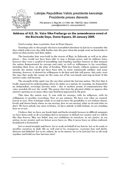 Address of H.E. Dr. Vaira Vike-Freiberga on the remembrance event of the Barricade Days, Dome Square, 20 January 2005