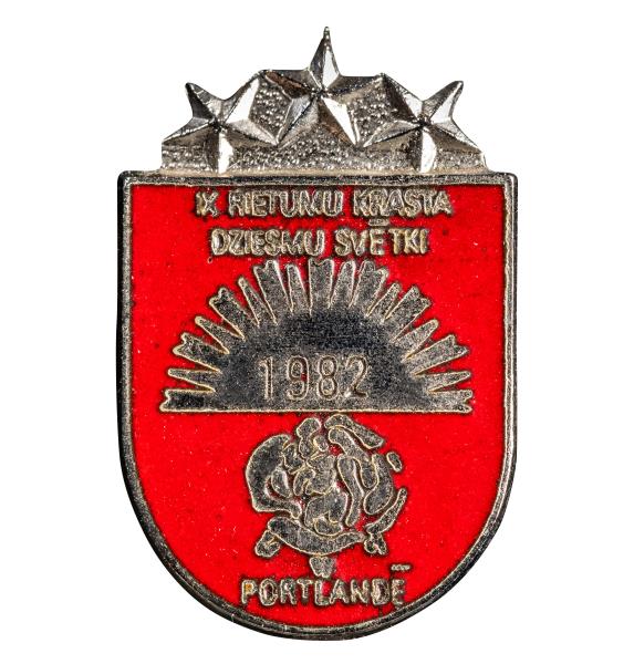 Metāla sudrabota ar sarkanu emalju nozīmīte, augšā 3 zvaigznes, zem tām: " IX Rietumu krasta dziesmu svētki", pusloka saules diskā gadskaitlis 1982, zemāk - "Portlandē". Aizmugurē īsa adata ar stiprinājumu (t.s. taurenīti).