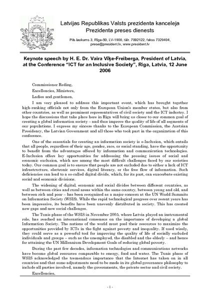 Keynote speech by H. E. Dr. Vaira Vīķe-Freiberga, President of Latvia, at the Conference “ICT for an Inclusive Society”, Riga, Latvia, 12 June 2006