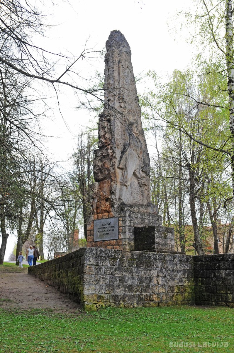 Piemineklis atklāts 1935. gada 11. augustā. Tēlnieks A. Julla. Pamatnes labajā pusē datējums 1919.22.06 un teksts: „Latviet, tev tēvzemes brīvību varoņi sniedza kā balvu, kad šai vietai tuvojies, tu zemu liec savu galvu”. Kreisajā pusē granīta plāksne ar uzrakstu: „Igauņi, piemiņa jums: talkā nācāt mums”. Pēc Otrā pasaules kara pazuda bronzas plāksnes ar uzrakstiem. Tagad tās aizvietotas ar granīta plāksnēm