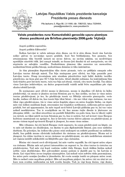 Valsts prezidentes runa Komunistiskā genocīda upuru piemiņas dienas pasākumā pie Brīvības pieminekļa 2006.gada 14.jūnijā