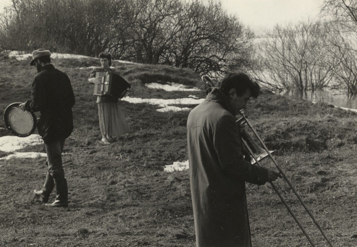Juris Boiko, Inguna Černova un Leonīds Codikovs performancē Pavasara tecīla (Juris Boiko, Inguna Černova and Leonid Tsodikov during the performance Grindstone of Spring) Foto / Photo: Māris Bogustovs. 1987