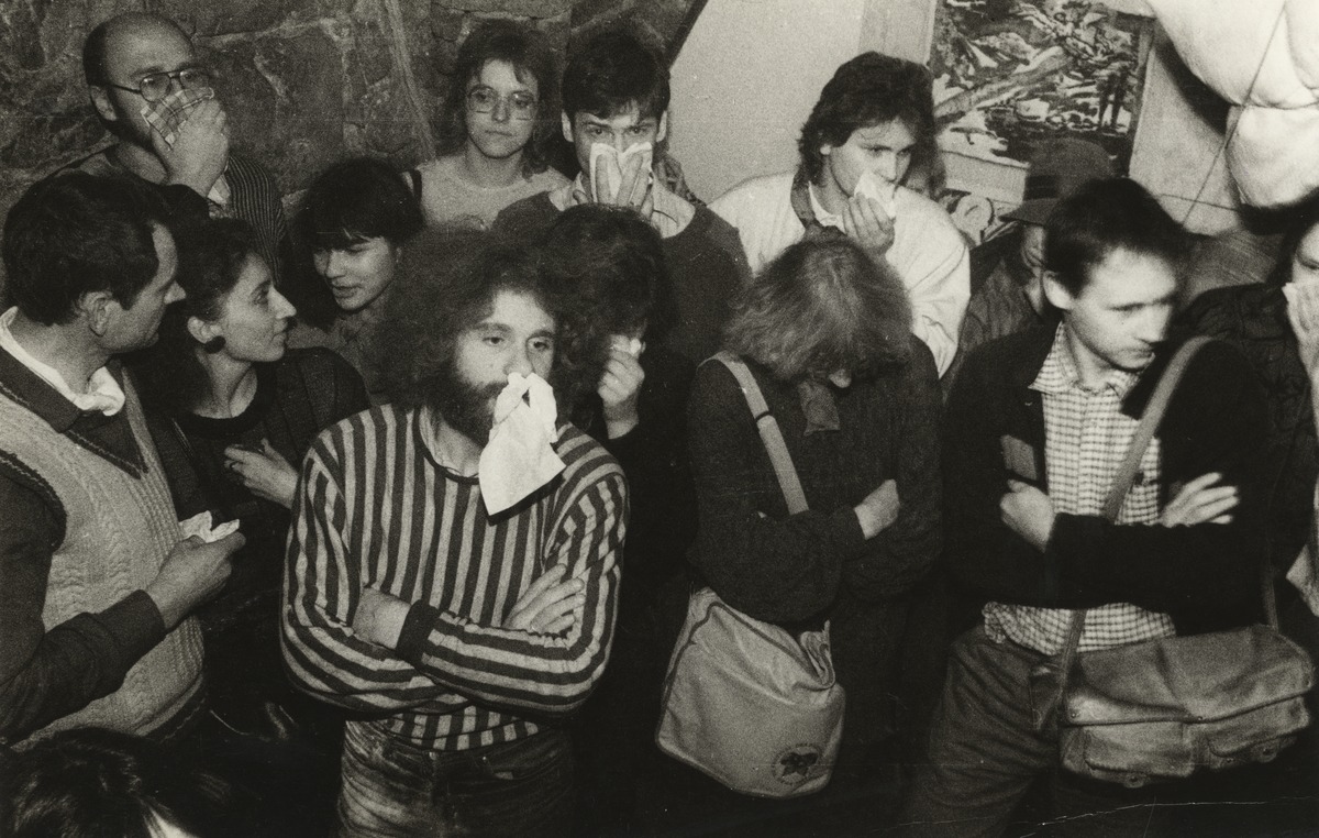 Vilnis Zābers. Otrā Aptuvenās mākslas izstāde Kurmis alā. Foto: Māris Bogustovs. 1988