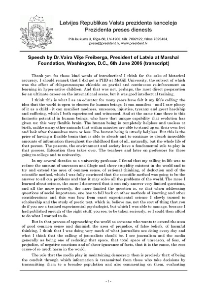 Speech by Dr.Vaira Vīķe Freiberga, President of Latvia at Marshal Foundation, Washington, D.C., 6th June 2006 (transcript)