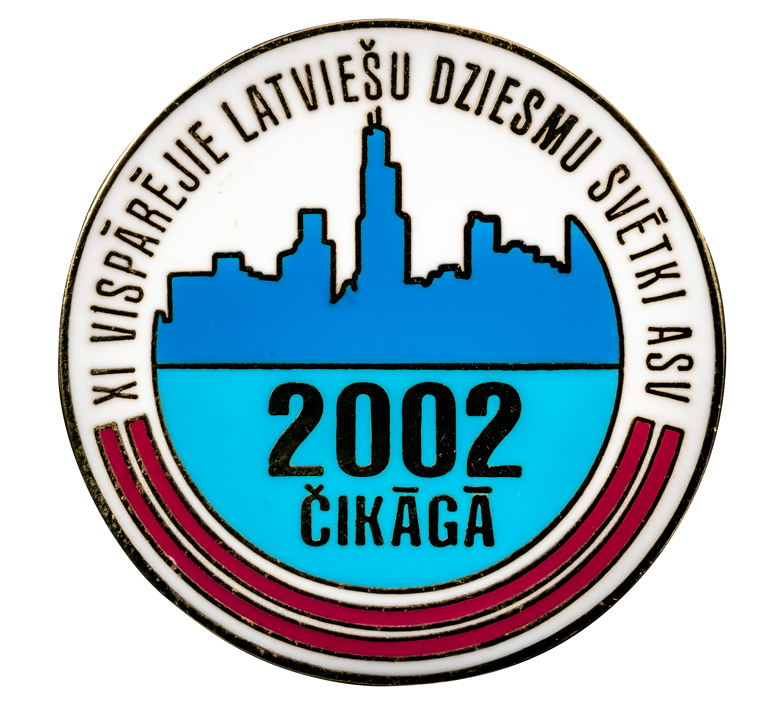 Apļveida, zilas, baltas un sarkanas emaljas un zelta krāsas 11. Vispārējo latviešu Dziesmu svētku Amerikā piespraude (2002, Čikāga). Vidusdaļā Čikāgas pilsētas zilas krāsas siluets uz balta fona. Gar apakšējo ārmalu Latvijas valsts karoga josla, gar augšējo ārmalu un vzem pilse'tas silueta uzraksts zelta krāsā "XI Vispārējie latviešu dziesmu svētki ASV 2002 Čikāgā". Rv. piestiprināts tauriņveida metāla stiprinājums.