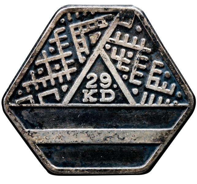 Sešstūra formas, sudraba krāsas piespraude, kam augšpusē dekoratīvas joslas ar latviskiem ornamentiem veido trīsstūri. Piepraudes centrā trīsstūrī uzraksts "29.KD". Apakšpusē atveidots Latvijas karogs. Gatavota Austrālijas latviešu 29.kultūras dienām Sidnejā 1979.gadā. Rv. piestiprināta horizontāla piespraude.Otrā pusē uzraksts "Perfection pla? / Sydney". Rv. piestiprināta horizontāla piespraude.
