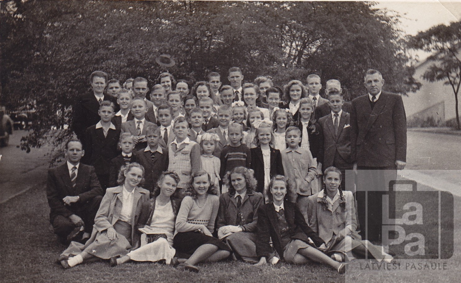 Sanpaulu latviešu baptistu draudzes svētdienas skolas skolēni ar skolotājiem. Kreisā pusē svētdienas skolas priekšnieks Gotfrīds Kārkliņš, labā – mācītājs Jānis Lukašs. Fotogrāfija uzņemta laikā posmā no 1934. līdz 1954. gadam.