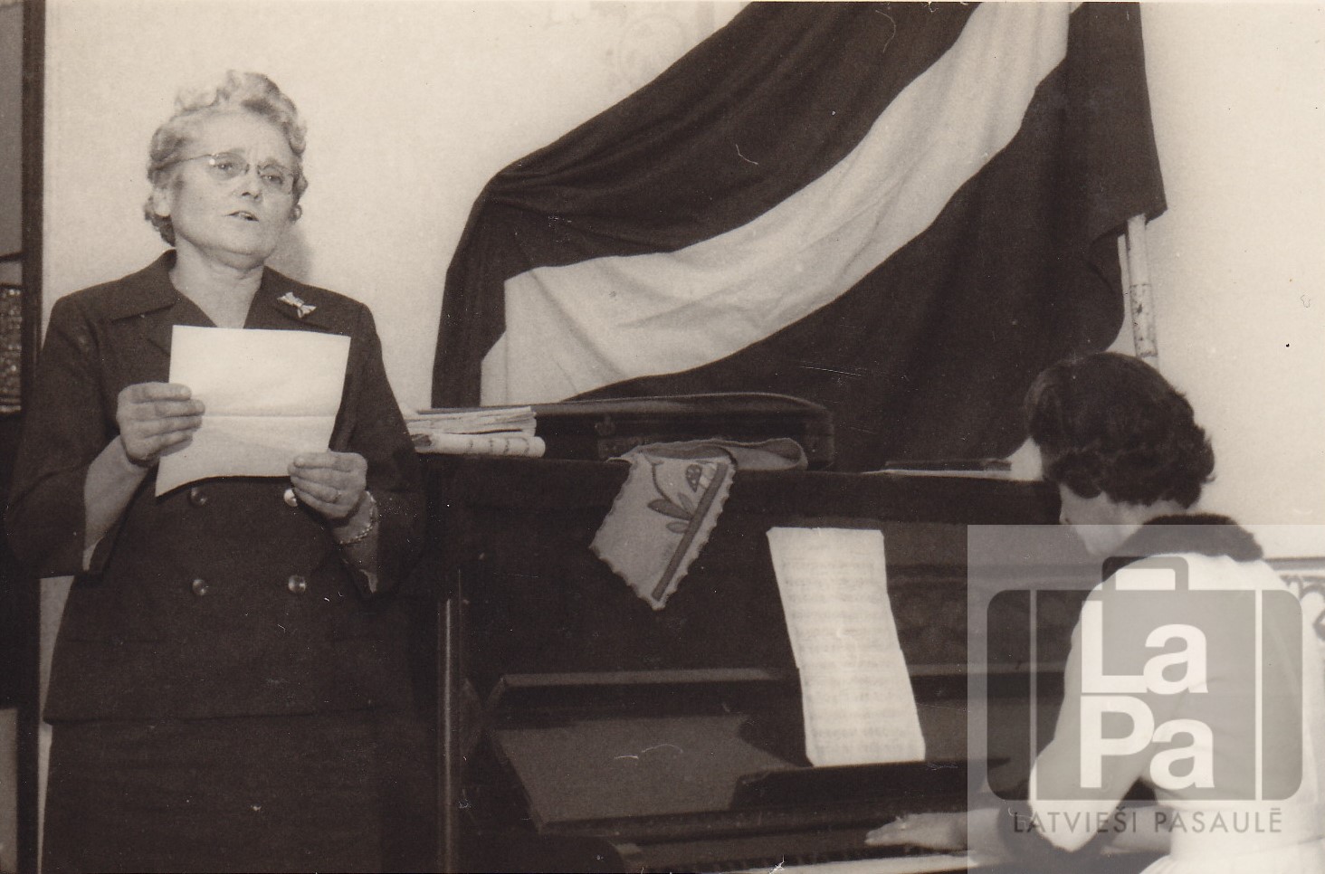 Emīlija Sproģis (dzimusi Keris) dzied Sanpaulu latviešu baptistu draudzes lūgšanu namā. 20. gadsimta 50. vai 60. gadi.