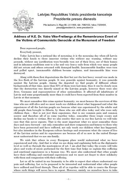 Address of H.E. Dr. Vaira Vike-Freiberga at the Remembrance Event of the Victims of Communistic Genocide at the Monument of Freedom