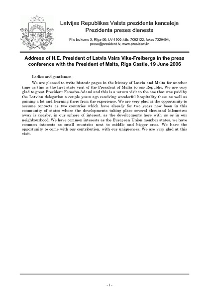 Address of H.E. President of Latvia Vaira Vike-Freiberga in the press conference with the President of Malta, Riga Castle, 19 June 2006