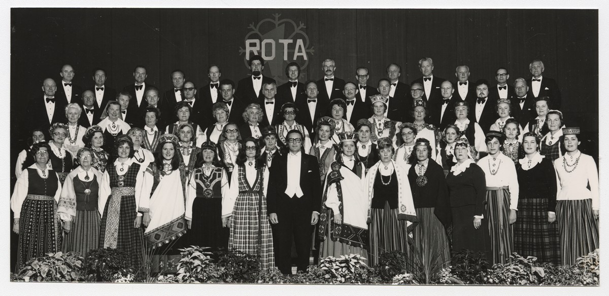 Melburnas Latviešu biedrības jauktais koris ROTA. Diriģents Viktors Bendrups (1.r. vidū). [Pēc gadskārtējā koncerta vai Austrālijas Latviešu 27. Kultūras dienās (?)]. Melburna, 1977.gads. Foto: nezināms.