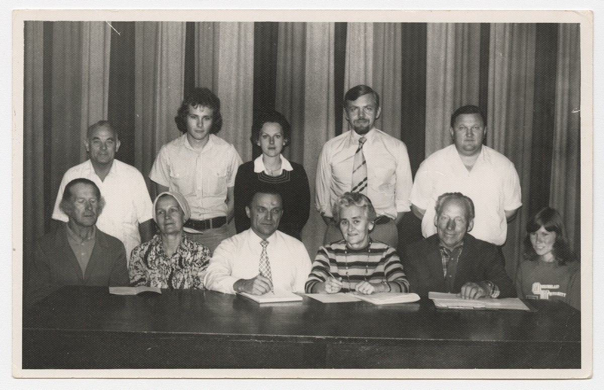 Austrālijas Latviešu 25. Kultūras dienu Rīcības komiteja. 1.r. centrā priekšsēdis Oskars Rudzītis. Brisbena, 1975.g. 25. - 31. decembris. Foto: nezināms.