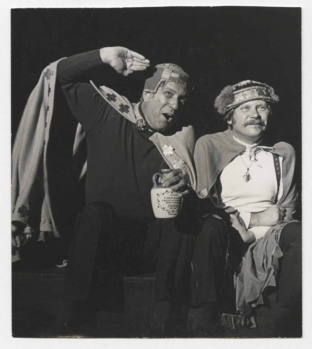 Austrālijas Latviešu 26. Kultūras dienas. Raibais saiets. Skats no teatrāla uzveduma "Tā mīlība man paņem sirdi..., veidotājs un dalībnieks Uldis Siliņš. Attēlā U.Siliņš (no kr.) un Juris Zemītis lomās. Kanberas teātra zāle, 1976.g. 31.decembris. Foto: nezināms.