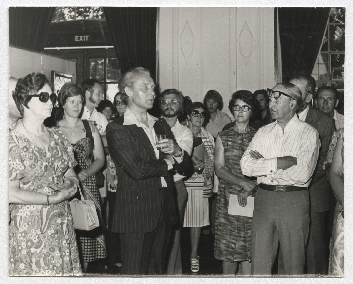 Austrālijas Latviešu 26. Kultūras dienas. Gleznu un daiļamatniecības izstādes atklāšana. Priekšplānā gleznotāji Reinis Zusters un Pēteris Bārdulis. Kanbera, 1976. gada 28.decembris. Foto: nezināms.