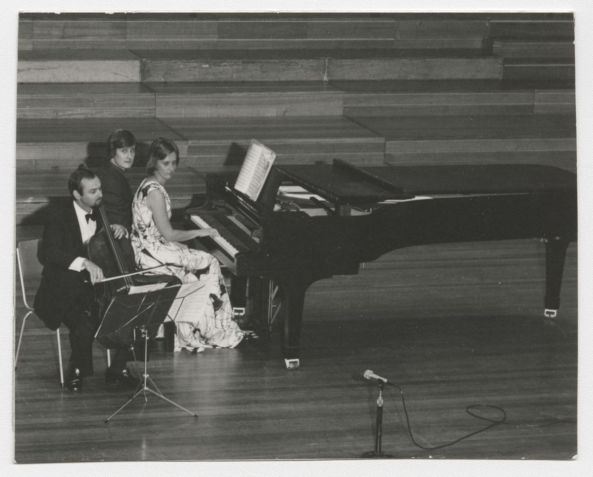 Austrālijas Latviešu 27. Kultūras dienas. Atklāšanas koncerts Bruksa zālē. Jānis Laurs (čells) un Zane Ritere (klavieres) atskaņo Tālivalža Ķeniņa Sonāti čellam un klavierēm. Melburna, 1977. gada 26.decembris. Foto: nezināms.