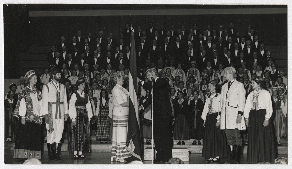 Austrālijas Latviešu 27. Kultūras dienas. Karoga nodošanas ceremonija kopkora koncertā. KD Rīcības komitejas priekšsēdis Gunārs Drulle nodod karogu 28. KD priekšsēdei Margaritai Biezaitei. Melburna, 1977.g. 30.decembris. Foto: nezināms.