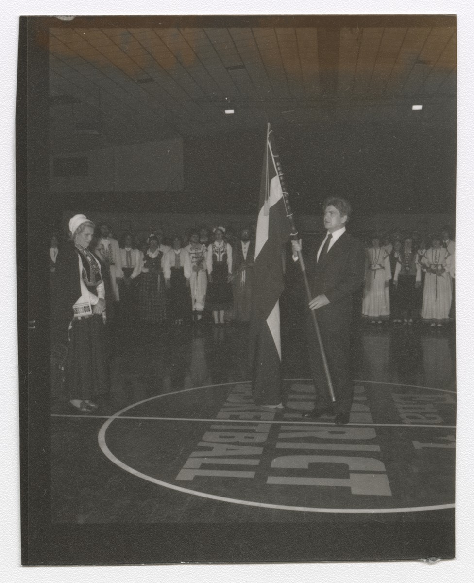 Austrālijas Latviešu 28. Kultūras dienas. Svinīgā KD karoga nodošanas ceremonija nākamo KD rīkotājiem. Priekšplānā Margarita Biezaite tautastērpā. Adelaida, 1978.g. 25. - 29. decembris. Foto: nezināms.
