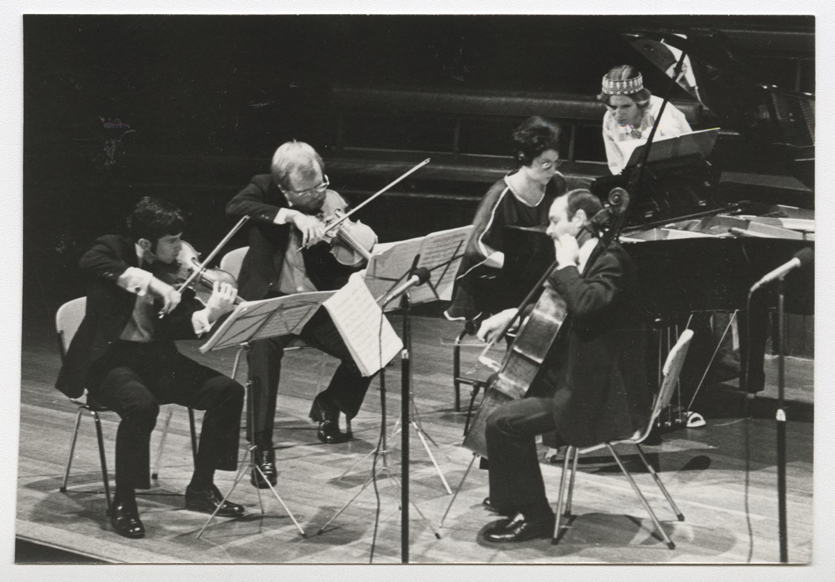 Austrālijas Latviešu 29. Kultūras dienas. Atklāšanas koncerts Sidnejas Pilsētas namā. Ansambļa New England Ensemble uzstāšanās. Pirmatskaņo Tālivalža Ķeniņa kvartetu Nr.2 klavierēm un stīgām (čells - Jānis Laurs). 1979.g. 26.decembris. Foto: nezināms.