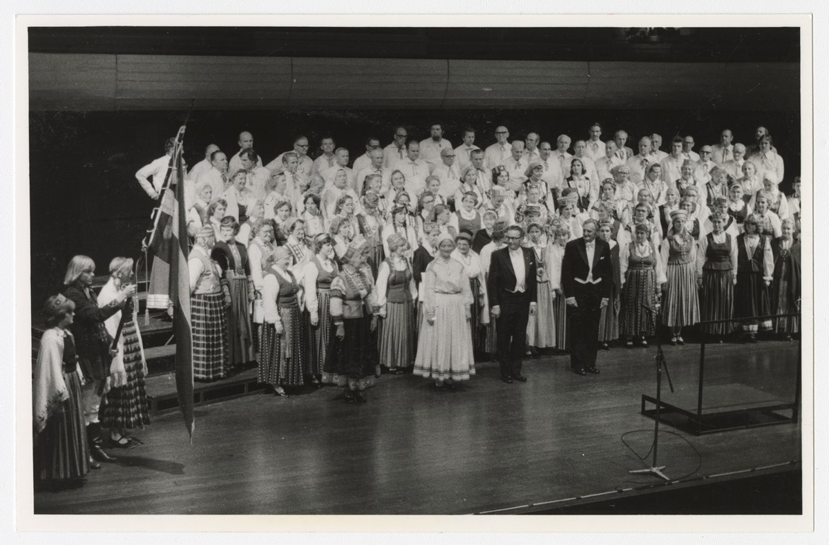 Kopkora koncerts. Pērtas koncertzālē. Priekšā diriģenti (no kr.): Vilma Roga, Lilija Zobens, Viktors Bendrups, Ēriks Ozoliņš