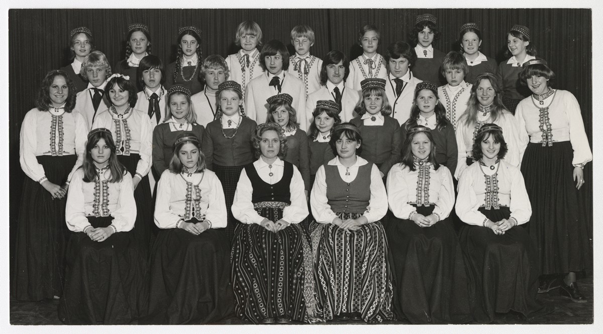 Austrālijas Latviešu 33. Kultūras dienas. Melburnas Tautas deju kopa "Sprīdītis". Vadītājas Rasma Celma un Gunta Vagare (1.r. 3., 4. no kr., abas Zemgales tautastērpos). Melburna. 1983.g. 27. - 31. decembris. Foto: nezināms.