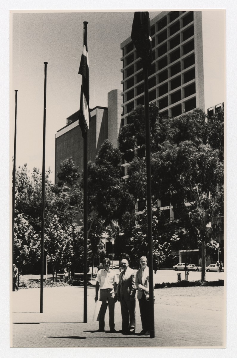 Austrālijas Latviešu 35. Kultūras dienas. Latvijas karoga uzvilkšana pie Pērtas pilsētas valdes nama. Pie karoga masta stāv (no kr.): Ivars Zalstiors, Jānis Plucis, Pauls Beks. 1985.g. 26. - 31.decembris. Foto: nezināms.