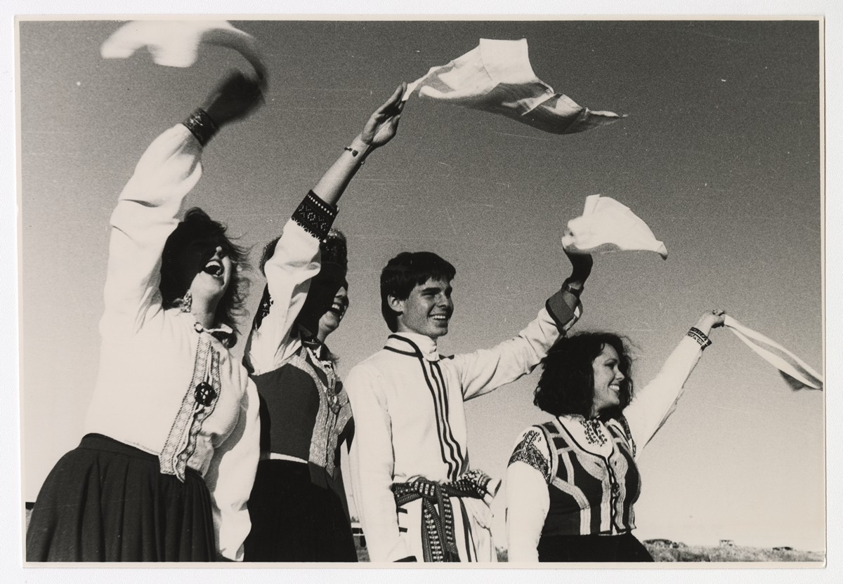 Jauniešu grupa māj ar lakatiņiem, no kr. Daina Timmermane, Inese Matisone, Edgars Geidāns, Gita Balode