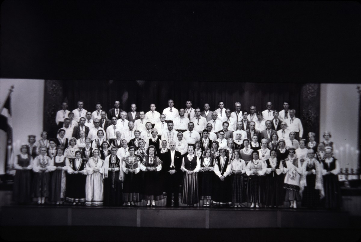 Diapozitīvs. Adelaidas Latviešu biedrības jauktais koris dzied Latvijas dibināšanas 50 gadu atceres koncertā. 1.r. vidū diriģents Kaspars Svenne. Sidnejas [Latviešu nama zālē], 1968.g. 16. - 18. novembris. Foto: nezināms.