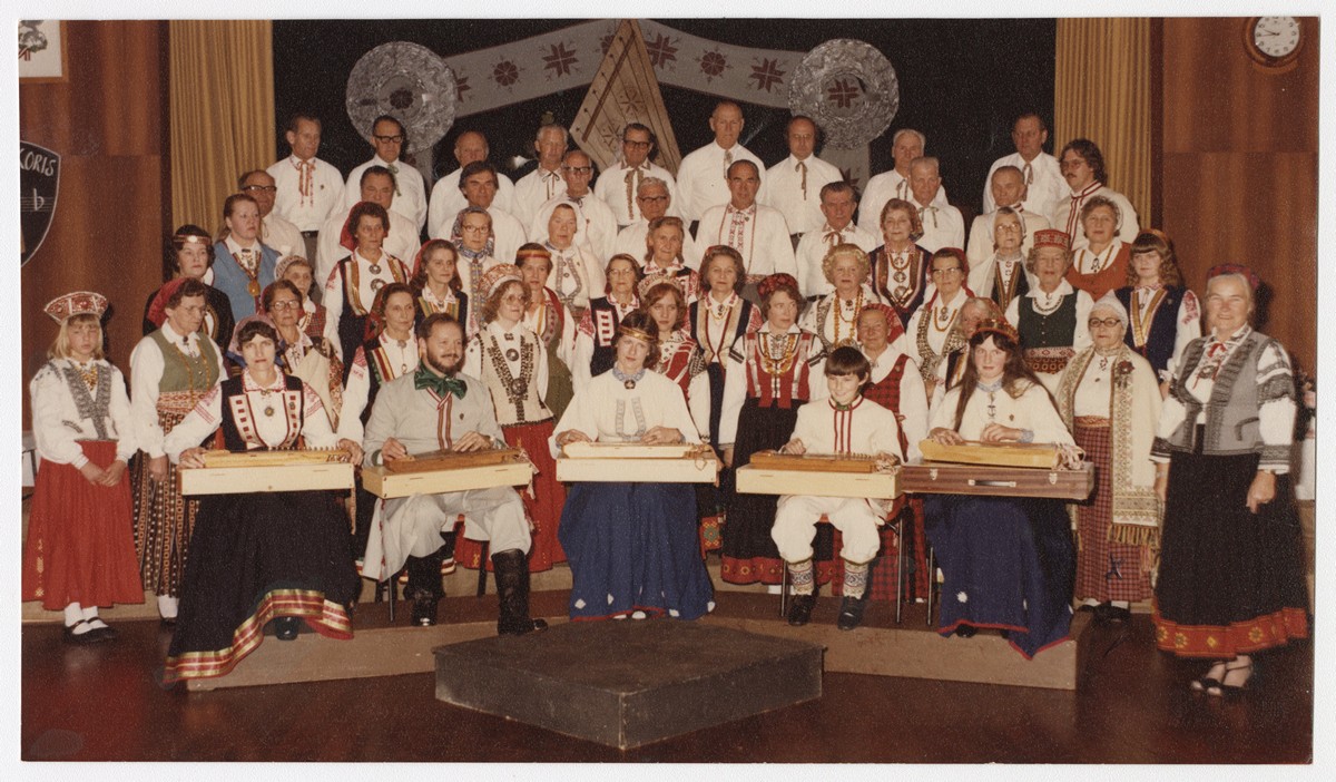 Austrālijas Latviešu 23. Kultūras dienas. Pērtas Latviešu jauktais koris un koklētāji. Diriģente Vilma Roga (labajā pusē, Bārtas tautastērpā). Sidneja, 1973.g. 25. - 29. decembris. Foto: nezināms.