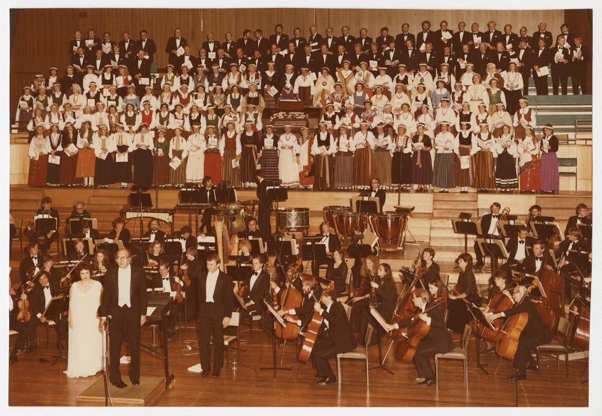 Austrālijas Latviešu 33. Kultūras dienas. Atklāšanas koncerts. Melburnas Dallas Bruksa zāle. Uz skatuves kopkoris ar Austrālijas filharmonisko orķestri pēc Alfr.Kalniņa operas "Baņuta" koncertuzveduma. Solisti Stella Aksarle (soprāns), Jānis Vēgners (bass-baritons), blakus solistei diriģents Arvīds Purvs. 1983.g. 26.decembris. Foto: nezināms.