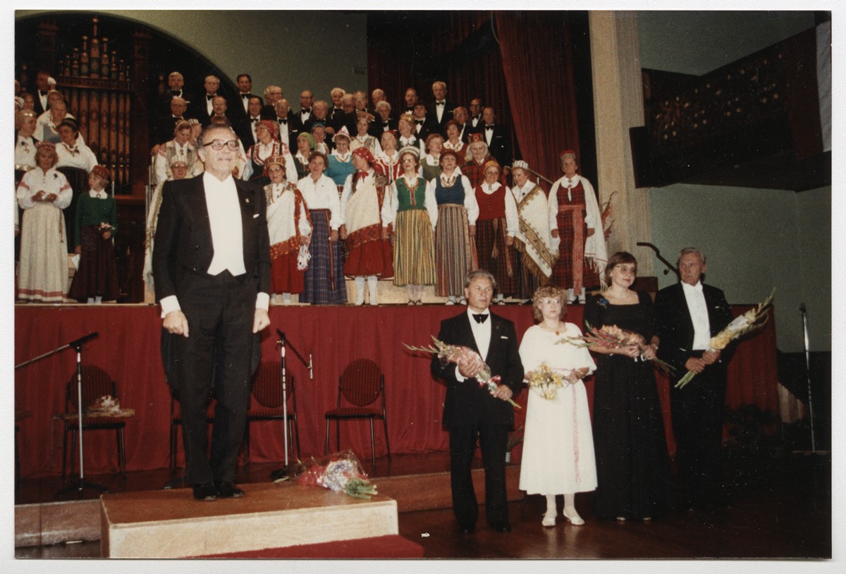 Austrālijas Latviešu 34. Kultūras dienas. Svētku kopkoris pēc koncerta, uz podesta Viktors Bendrups, labajā pusē pārējie virsdiriģenti - Staņislavs Līvmanis, Kristīne Mellēna, Astra Kronīte, Ēriks Ozoliņš. Lonsestona, Tasmānija, 1984.g. 30.decembris. Foto: nezināms.