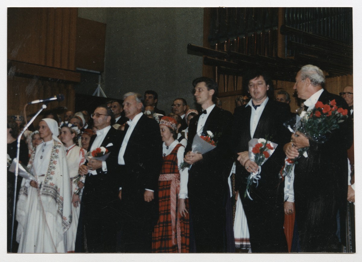 Austrālijas Latviešu 38. Kultūras dienas. Pēc kopkora koncerta, priekšplānā diriģenti ar ziediem. No kr.: Zane Ritere, Viktors Bendrups, solists Pauls Berkolds, diriģ. Edgars Kariks un Haralds Rutups. Brisbena, 1988.g. 30.decembris. Foto: nezināms.