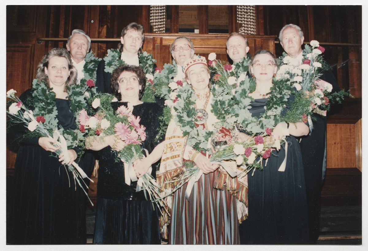 Austrālijas Latviešu 39. Kultūras dienu diriģenti ar ziediem, pēc kopkora koncerta. No kr.: 1.r. Daina Jaunbērziņa, soliste Stella Aksarle, Ruta Brože, Astra Konīte; 2.r. Ēriks Ozoliņš, Kārlis Beinerts, Viktors Bendrups, Juris Balodis, Haralds Rutups. Melburnas Latviešu nama zāle, 1989.g. 30.decembris. Foto: nezināms.