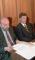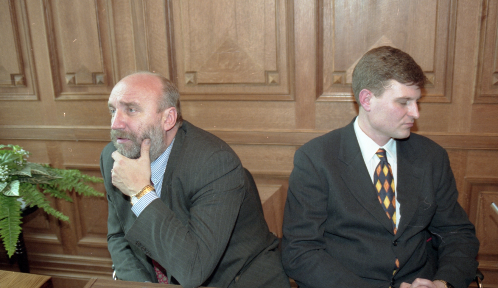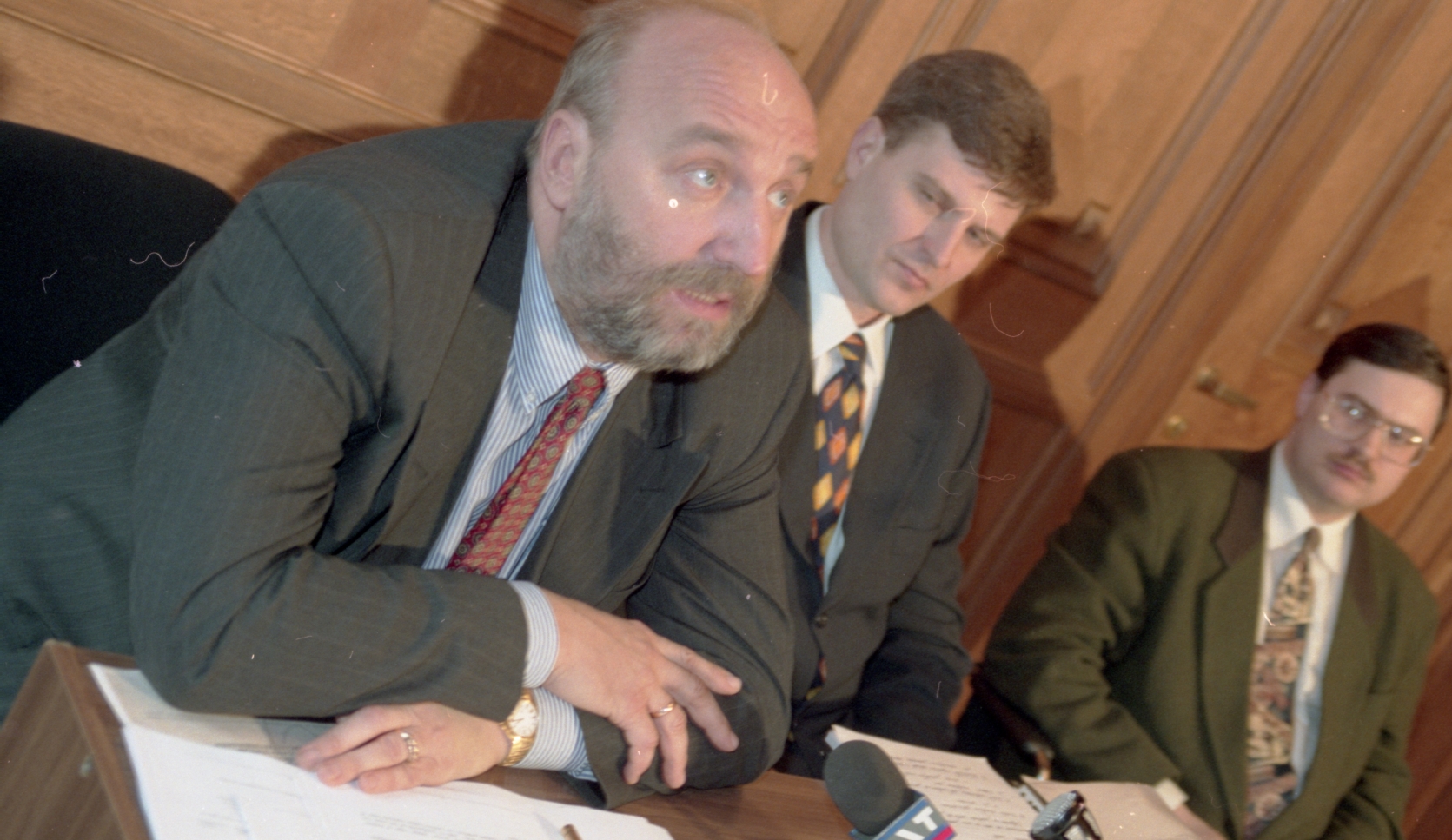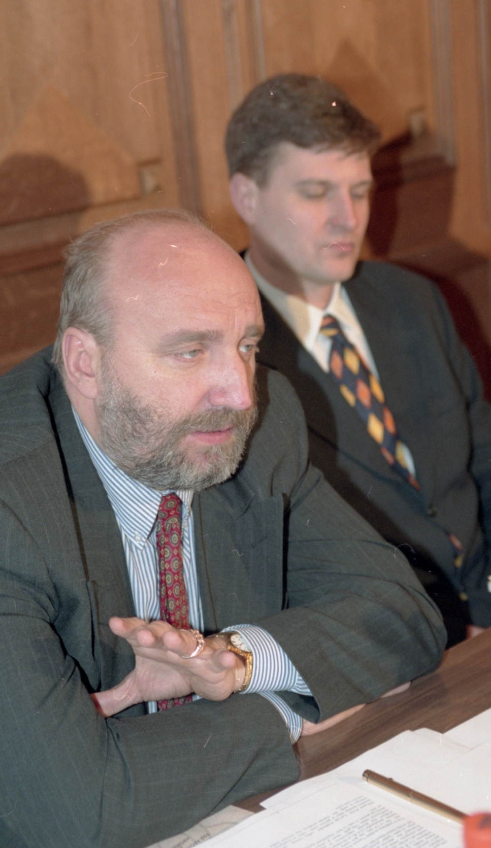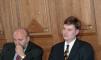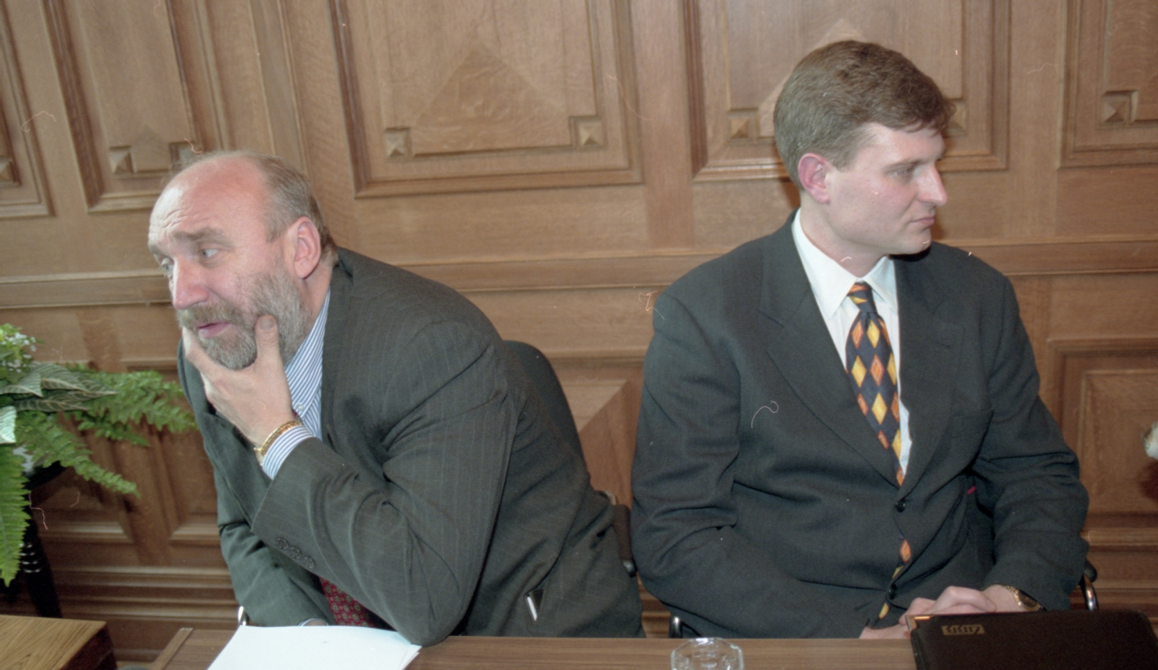 Preses konference Latvijas krājbankā. Ivars Godmanis, Arnolds Laksa.
