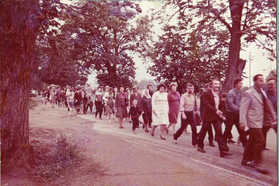Svinīgais gājiens par godu celtnieku dienai. No labās: elektromontieris Imants Diedišķis, aiz viņa elektromontieris Vilnis Kristlībs, aiz viņa iekārtu regulētājs Nikolajs Reva.