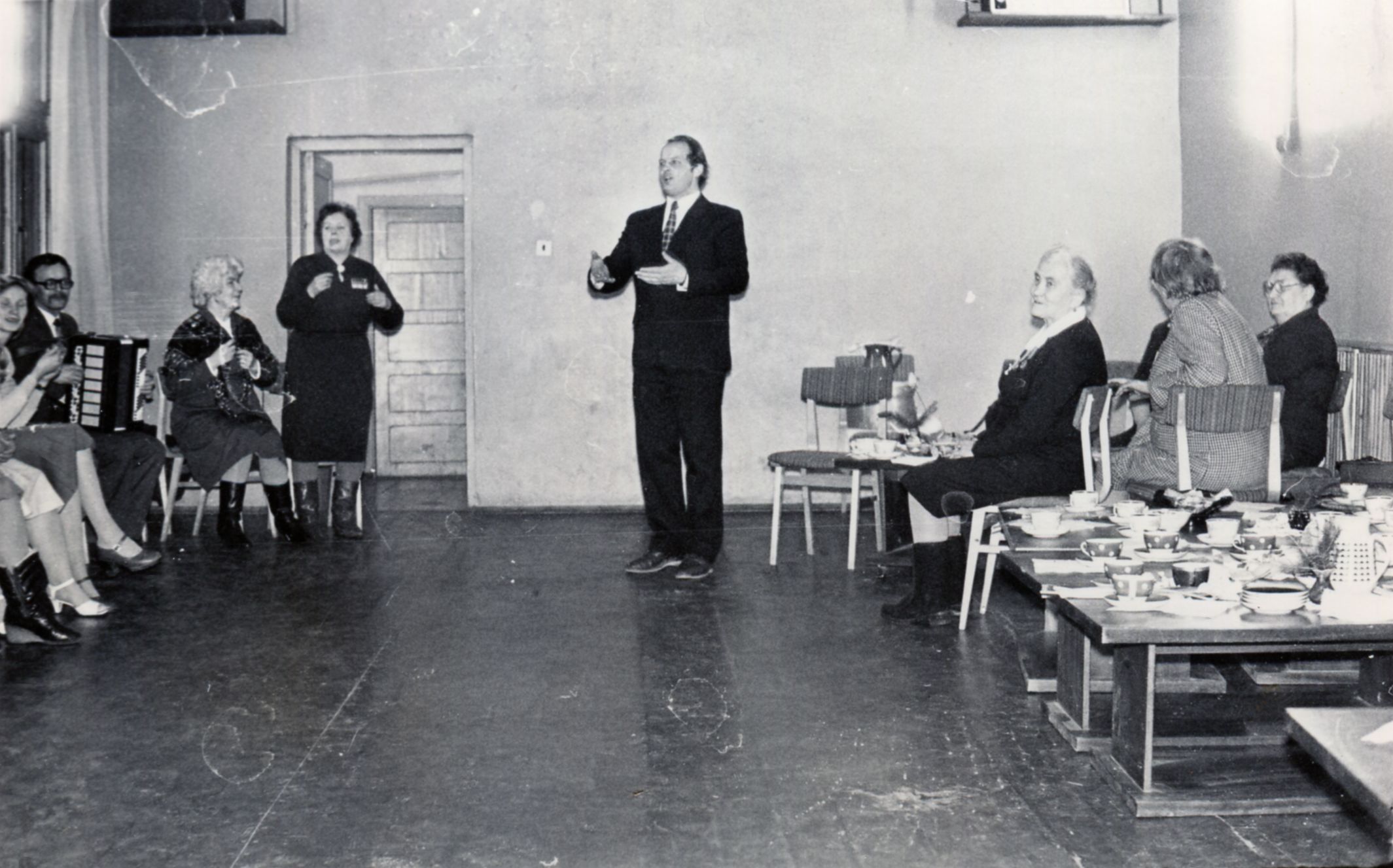 Uzstājas atturības veicināšanas pirmorganizācijas vadītājs Modris Indriksons. Pie durvīm stāv Lielā tēvijas kara veterāne Vallija Andersone, sēž - Olga Kozina.