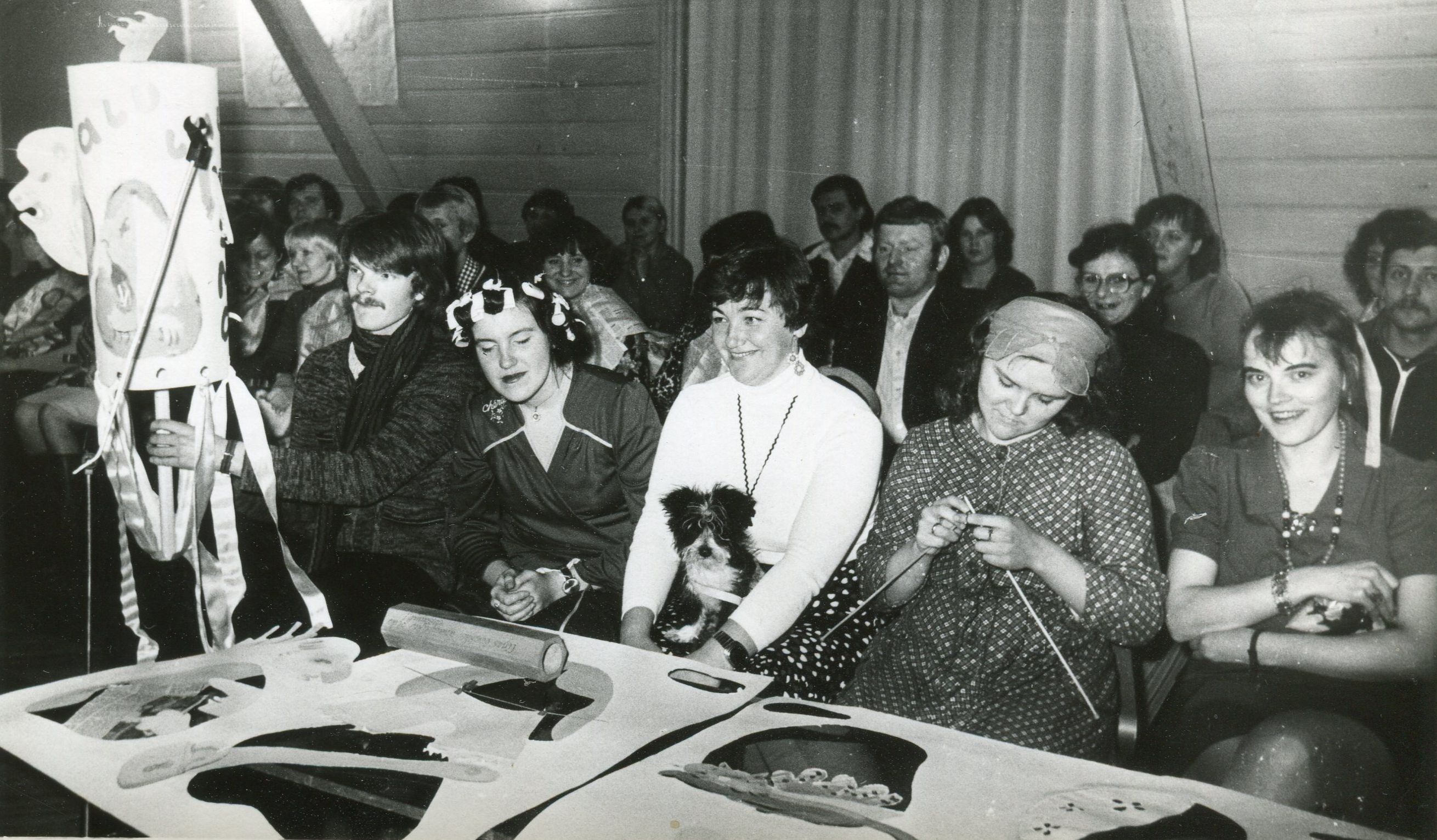 "Jautro asprātīgo klubs" starp rūpnīcas "Usma" un kolhoza "Uzvara" kolektīviem. No labās: Agra Vāvere, Tatjana Mikajeva, Aina Robežniece, Daiga Šulce(Siliņa); otrā rindā starp Mikajevu un Robežnieci - Aleksandrs Popovs.