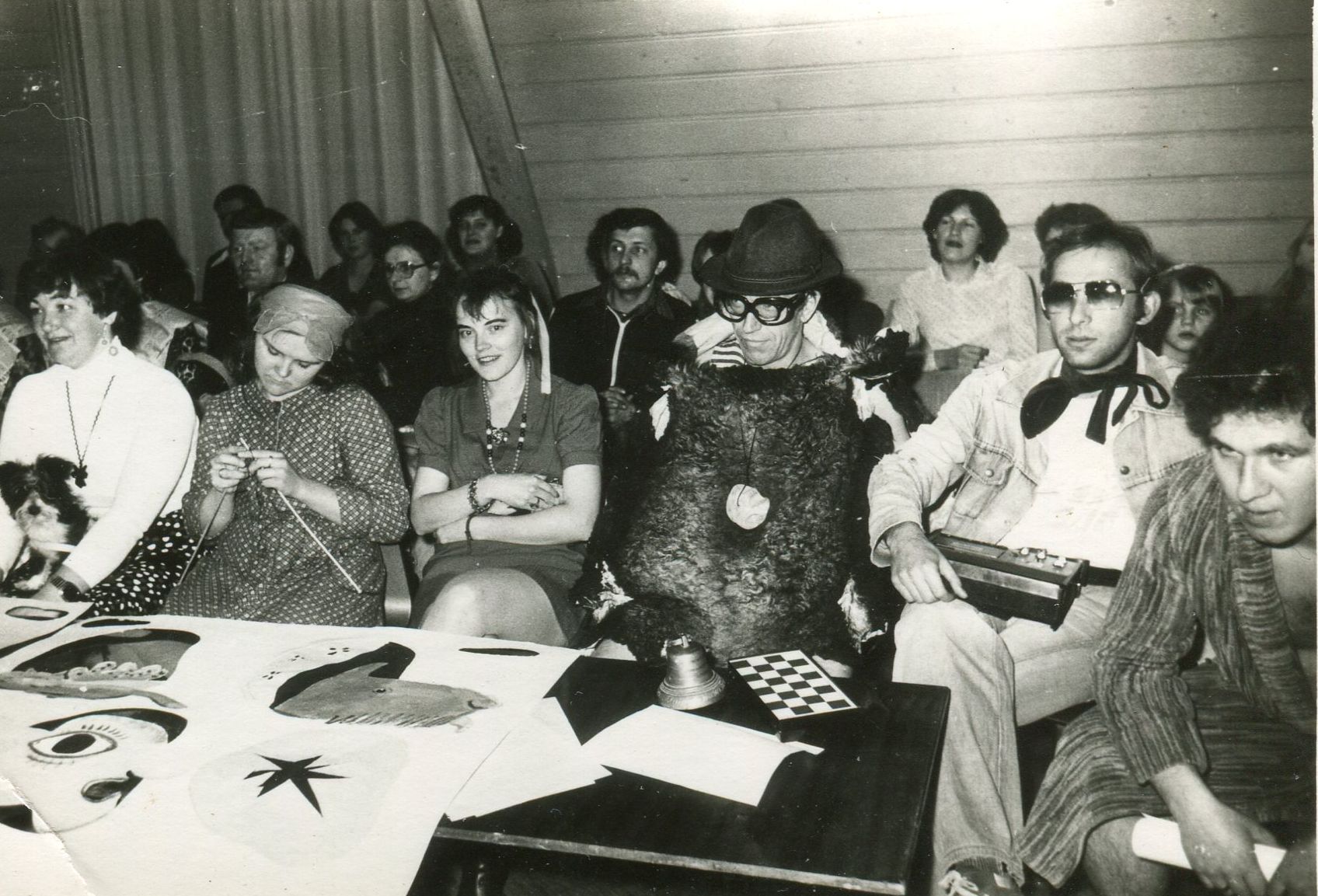 "Jautro asprātīgo klubs" starp rūpnīcas "Usma" un kolhoza "Uzvara" kolektīviem. No kreisās: Daiga Šulce(Siliņa), Aina Robežniece, Agra Vāvere, Oskars Junkars; no labās: Viktors Širokovs.
