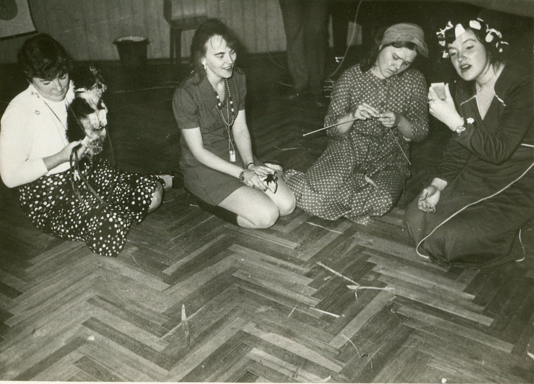 "Jautro asprātīgo klubs" starp rūpnīcas "Usma" un kolhoza "Uzvara" kolektīviem. No kreisās: Aina Robežniece, Agra Vāvere, Tatjana Mikajeva, Daiga Šulce(Siliņa).