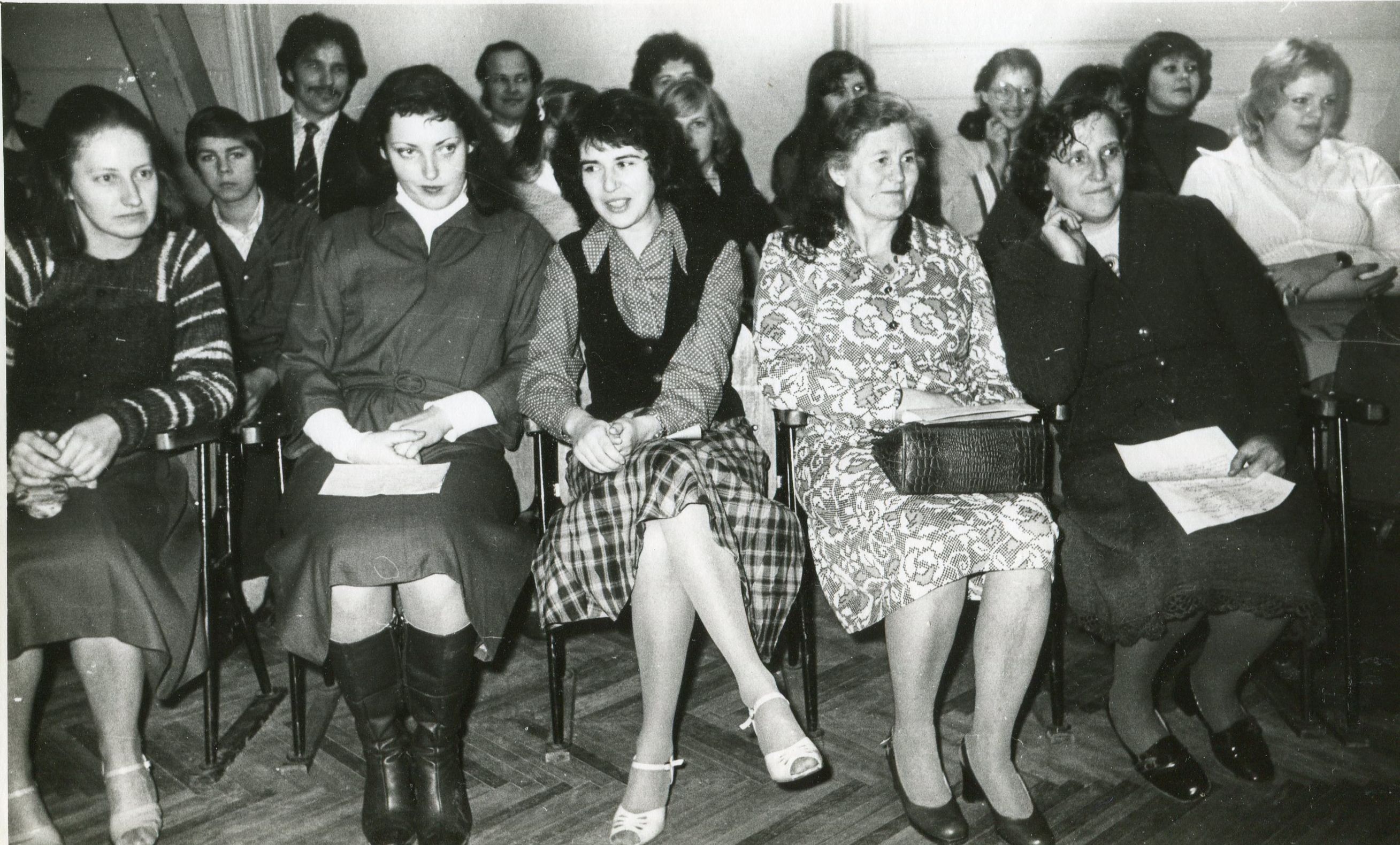 "Jautro asprātīgo klubs” starp rūpnīcas "Usma" un kolhoza "Uzvara" kolektīviem. No kreisās: Laimdota Junkara, ?, Gunta Pēce, Valentīna Sviķekalne, Monta Indriksone( strādāja ēdnīcā), Alla Križanovska.