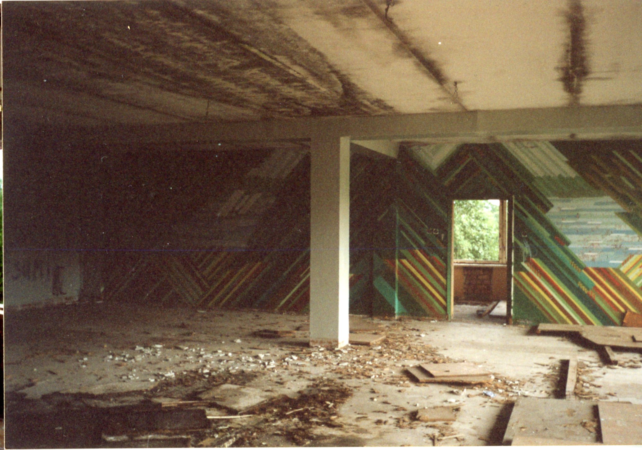 Pasākumu zāle. Vēl redzami mākslinieces Laimdotas Junkaras sienu zīmējumi.