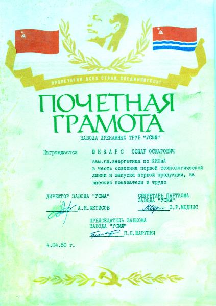 Oskaram Junkaram pasniegtais goda raksts. Diplomu parakstījis rūpnīcas direktors Anatolijs Fetisovs, partijas sekretārs Edgars Mednis, arodbiedrības priekšsēdētāja Tatjana Suhorukova, rūpnīcas komitejas priekšsēdētājs Pāvils Šarupičs.