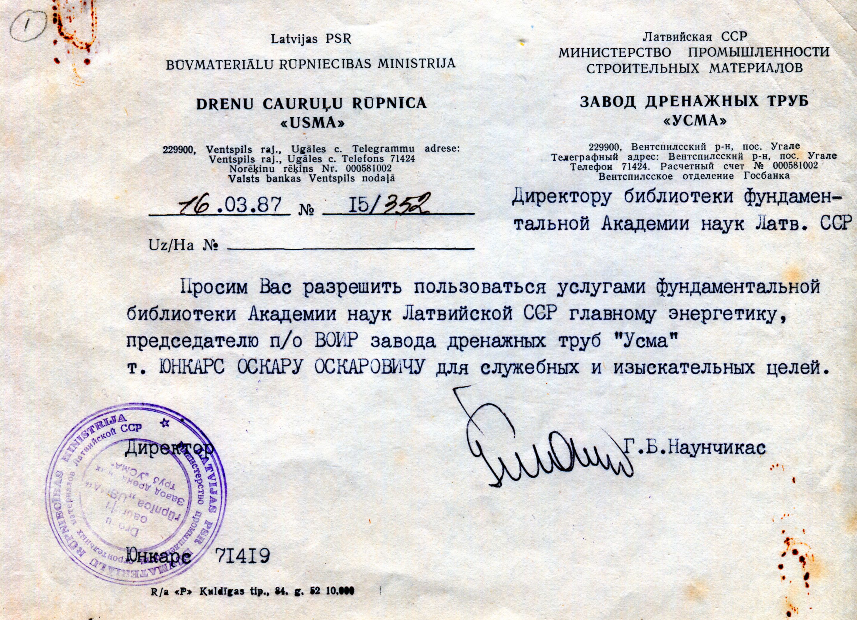 Veidlapa uz kuras redzami rūpnīcas "Usma" rekvizīti, zīmogs un direktora Ģedimina Naunčika paraksts.