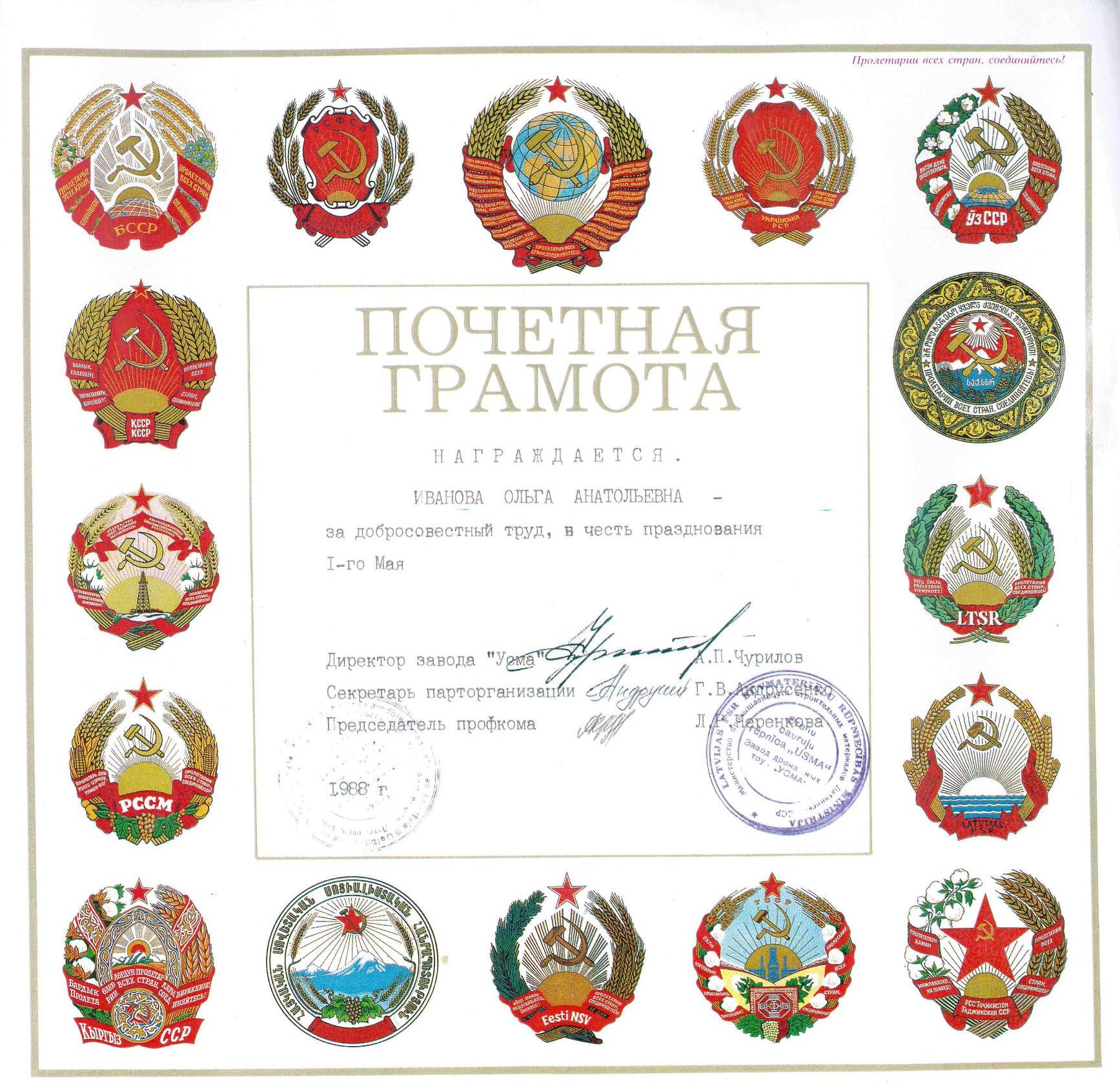 Ivanovai Olgai Anatolija meitai par godprātīgu darbu. Goda rakstu parakstījis rūpnīcas direktors Andrejs Čurilovs, Partijas sekretāre Valentīna Andrusenko, arodbiedrības priekšsēdētāja Ļubova Čerenkova. Labi redzams rūpnīcas "Usma" zīmogs.