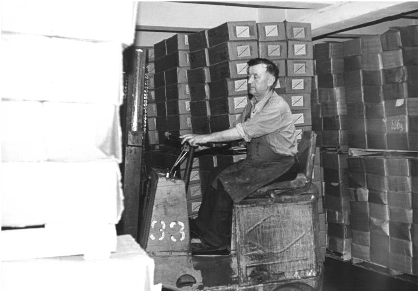 Elektroiekrāvējs gatavās produkcijas noliktavā.