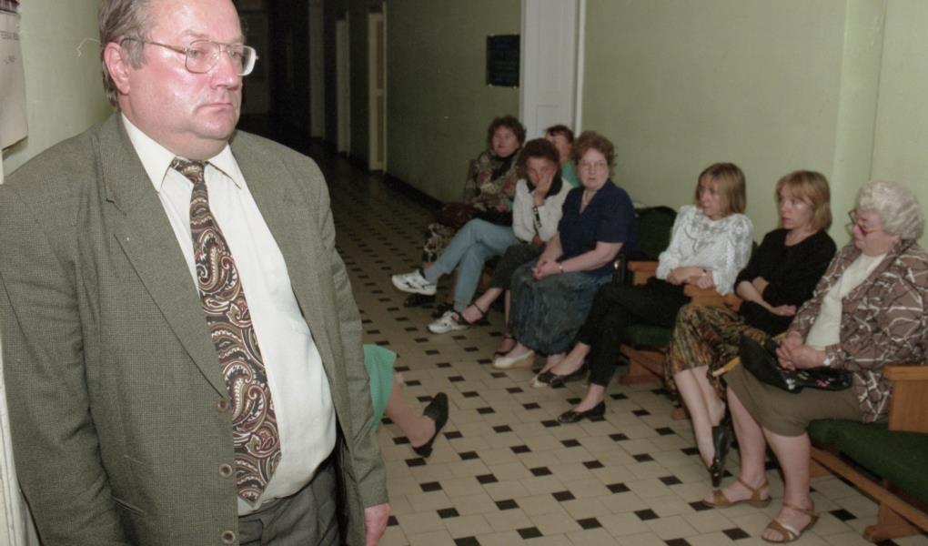 Porcelāna fabrikas darbinieču badastreiks. Jānis Paukštello un Akvelīna Līvmane. - Znotiņš, Ilmārs, 1966- - 1997-06-16 (Fotogrāfija)