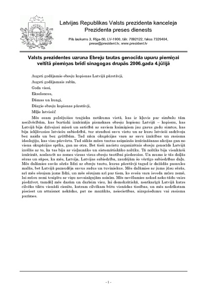 Valsts prezidentes uzruna Ebreju tautas genocīda upuru piemiņai veltītā piemiņas brīdī sinagogas drupās 2006.gada 4.jūlijā