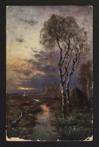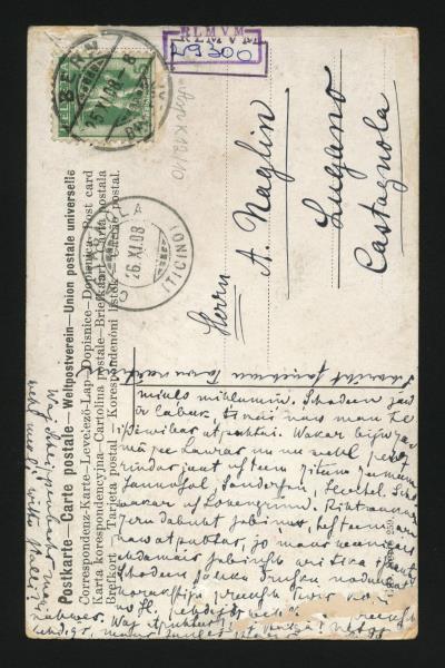 Ilustrēta atklātne ar nezināma autora gleznas — rudens ainavas — krāsainu reprodukciju (RTMM 29300). Teksts rakstīts ar melnu tinti. Atklātne adresēta: „Herrn A. Naglin, Lugano, Castagnola.” Pasta zīmogi: „Bern 25.XI.08.; Castagnola 26.XI.08.” Oriģināls nedaudz bojāts, slikti salasāmas teksta pēdējās rindas. Pirmpublicējums. Nosūtīšanas vieta un datējums noteikts pēc pasta zīmoga.